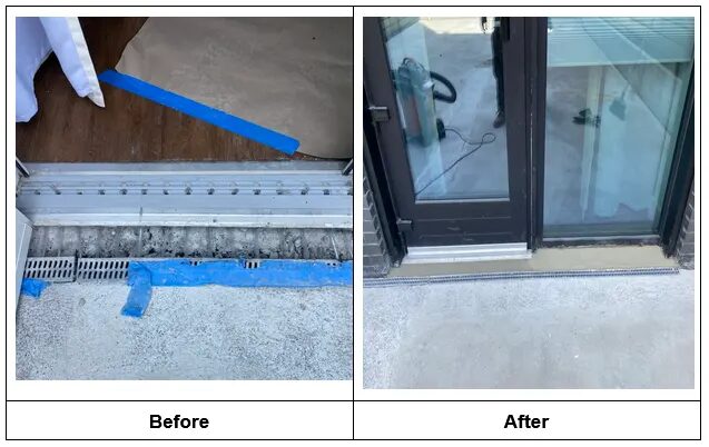 Our inspection revealed a lack of effective water drainage from the weep holes beneath the door saddle. Additionally, the surrounding concrete was improperly sloped, contributing to water pooling near the foundation. To deliver a long-term solution, we proposed a targeted exterior waterproofing system combined with high-strength concrete repair.