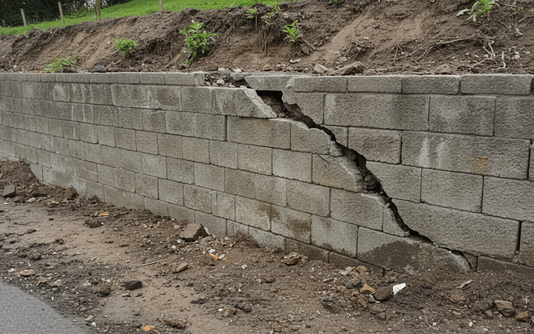 Retaining walls fail when lateral earth pressures exceed their design strength, often due to poor drainage, undersized footings, or unexpected surcharge loads.