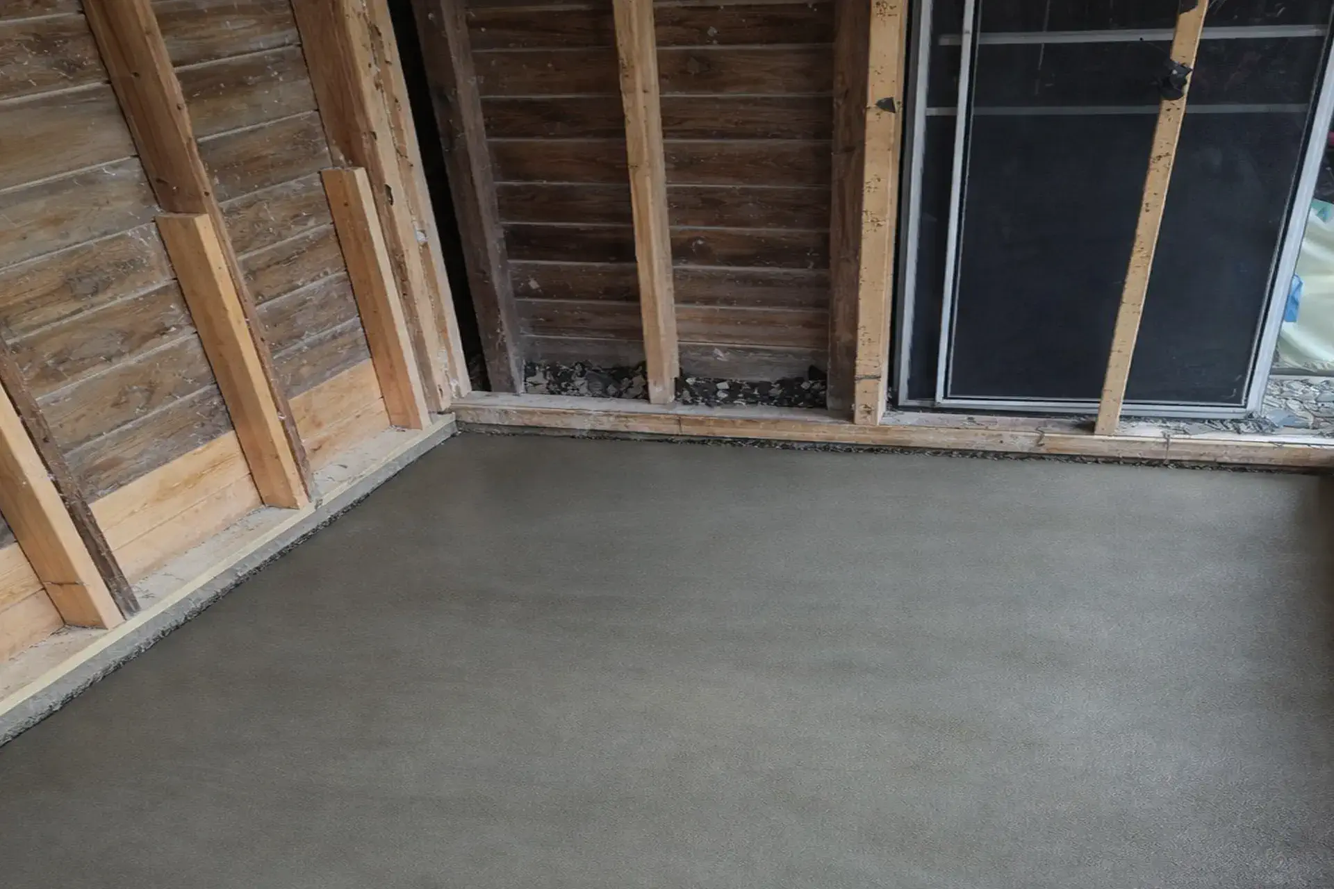 The slab had visible deterioration and was supporting a wooden platform and finished sheetrock walls and ceiling. Over time, moisture and ground movement caused the concrete to weaken. The slab was no longer a safe or reliable surface.