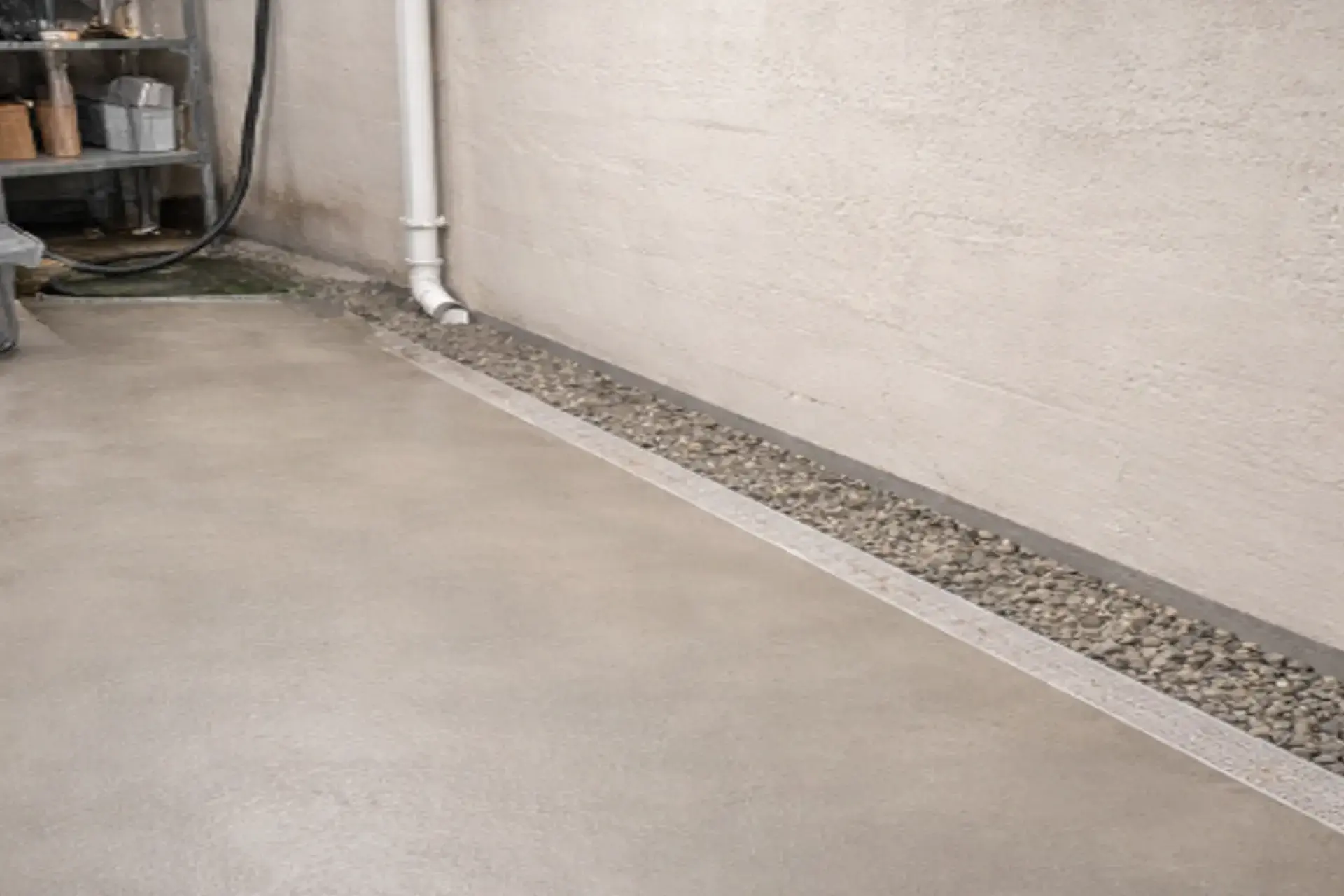 We installed a perforated PVC pipe to serve as a pressure relief system. This system relieves hydrostatic pressure and removes the need for a sump pump.
